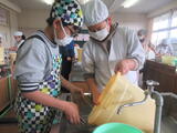 翌日に開催される収穫感謝の会に向けて、5年生は当日使用するもち米の準備を行いました。感謝の会では、3種類のもち料理とお土産用の紅白もちを振舞うため、食生活改善推進員の方々に教えられながらお米をたくさんといで、準備完了。6年生も会場づくりをがんばりました。